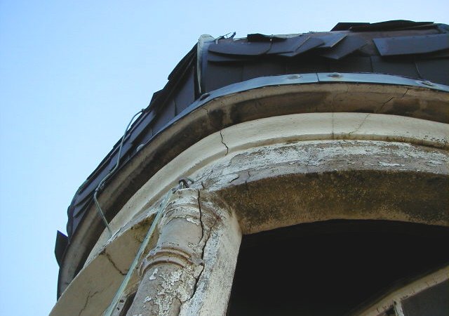 Der Turmschaft aus Ziegelmauerwerk wurde durch korrodierende Stahlträger der Zwischendecke auseinandergedrückt.