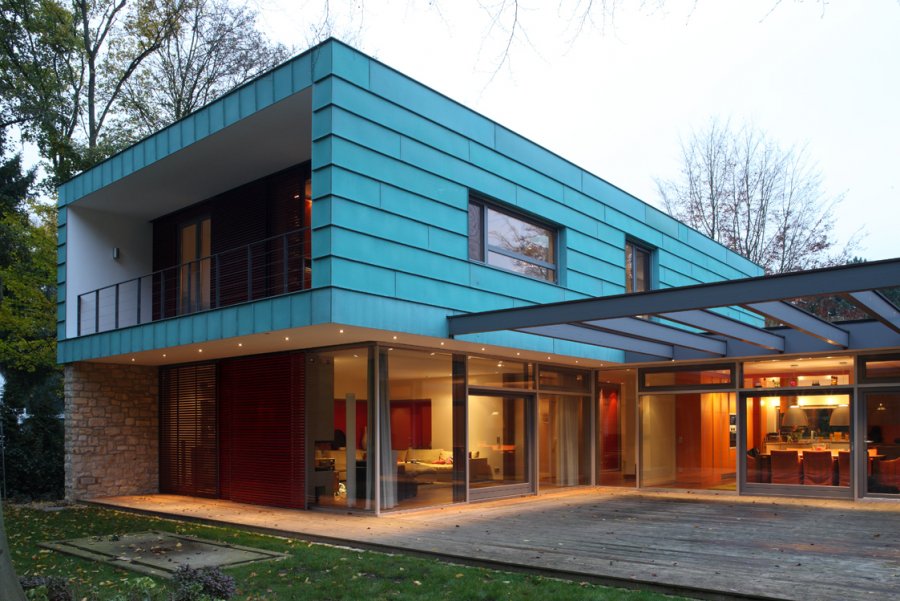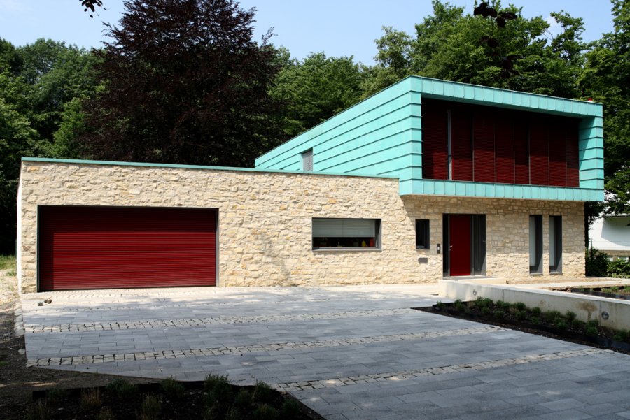 Einfamilienhaus in teilmassiver Bauweise, teilweise Holzrahmenbau, welcher auf einer punktgestützten Stahlbetonplatte ruht.